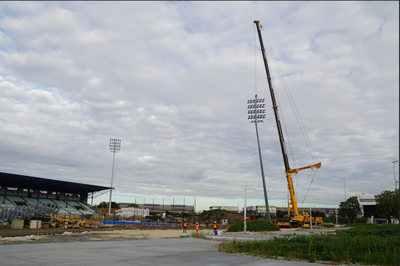 Pose de candélabres 20m par héliportage avec 5 projecteurs par mâts: STADE BETHISY SAINT PIERRE